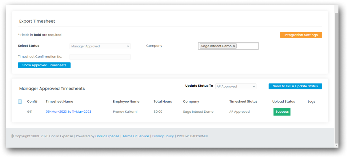Gorilla Expense offers full integration to push timesheet data to Sage Intacct. The Admin user can fetch all “Manager Approved” Timesheets and send them to Sage Intacct via the Sage Intacct API. This process can be automated as well.